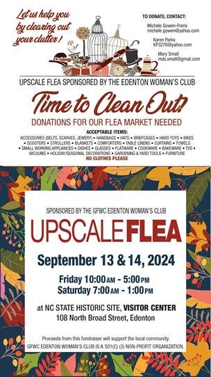 Upscale Flea MarketThis Event has no scheduled dates at this time. It last occurred on Saturday, September 14, 2024.Event Description: Enjoy a day at the flea market! Visit event website for more informationSee more information and events from Edenton Women's ClubWhere is the event?Historic Edenton State Historic Site108 N Broad StEdenton(252) 482-2637Edenton Women's Club (484) 883-7108 Get more information
